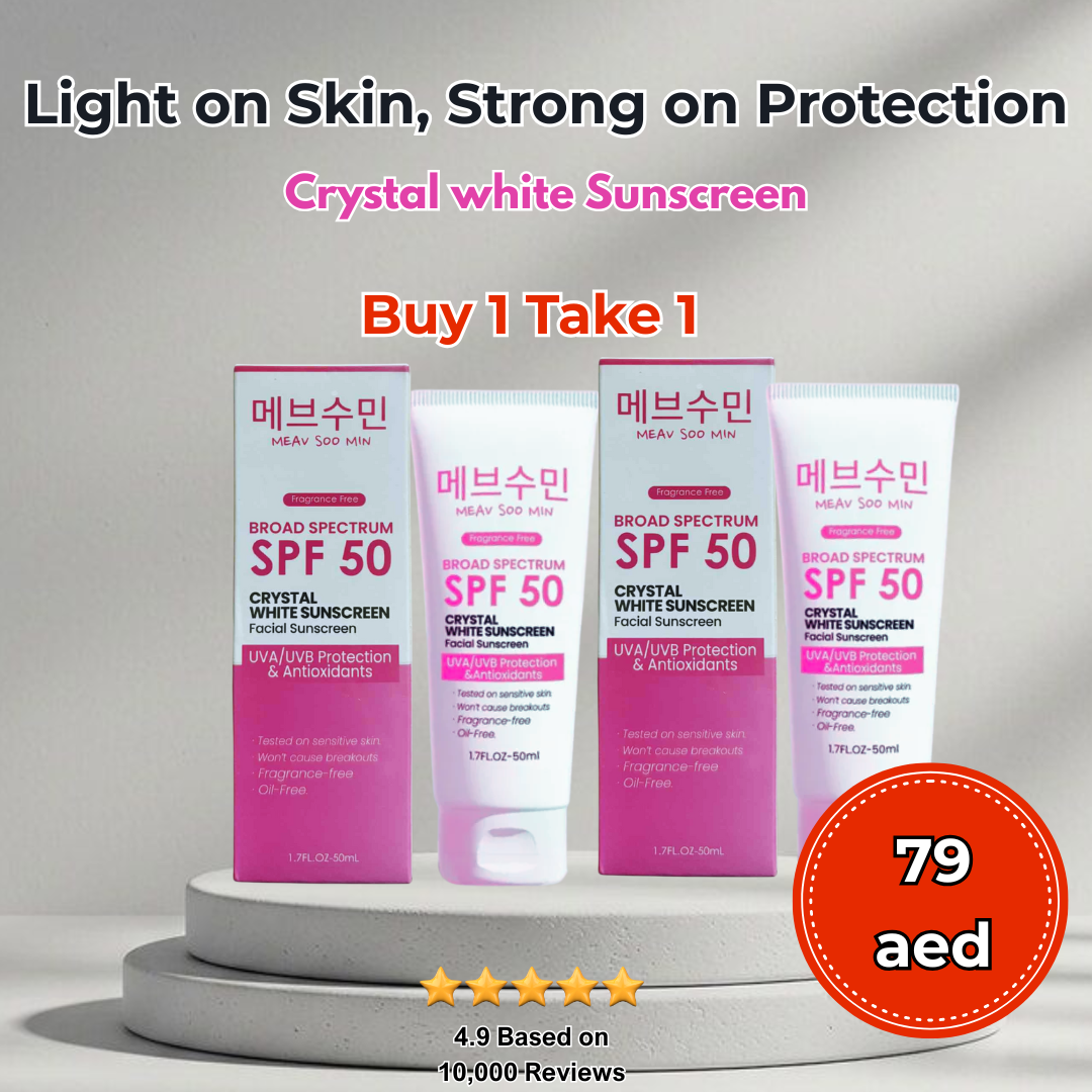 Unlike traditional sunscreens that feel heavy or greasy, Meav Soo Min Crystal White Sunscreen is lightweight, non-comedogenic, and suitable for all skin types, including sensitive and acne-prone skin. Now available in a convenient Buy 1 Take 1 offer, it is easy to incorporate into your daily skincare routine while ensuring long-lasting protection and skin brightness.